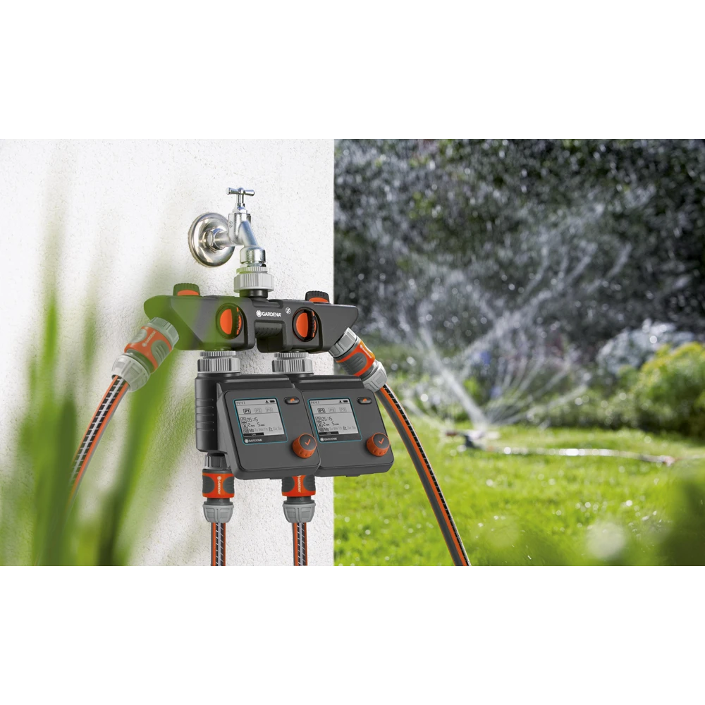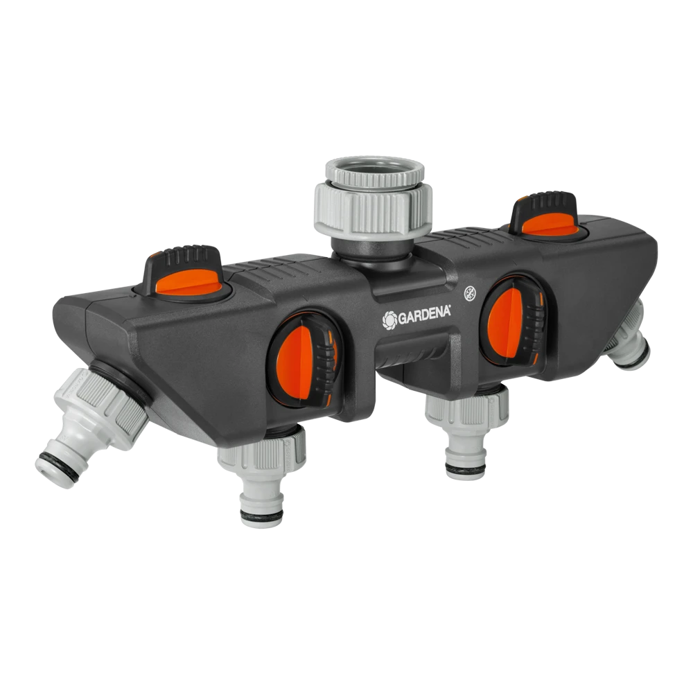 Met de GARDENA 4-weg waterverdeler kunt u gelijktijdig diverse accessoires aansluiten op één kraan. De waterafgifte kan voor elke aansluiting afzonderlijk worden geregeld of afgesloten. Op de 4-weg waterverdeler kunnen twee GARDENA besproeiingscomputers of watertimers worden aangesloten. De 4-weg waterverdeler kan met het Prof-System kraanstuk (art.nr. 2801-20) worden omgezet in het GARDENA Prof-System voor een grotere waterdoorvoer.De GARDENA 4-weg-waterverdeler is geschikt voor 26,5 mm (G3/4)-waterkraan met en 33,3 mm (G 1)-draad en 21 mm (G 1/2)-waterkraan met 26,5 mm (G 3/4)-draad.