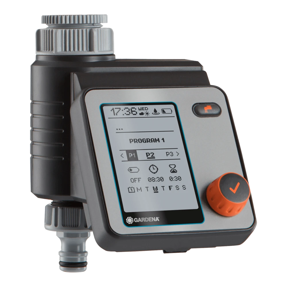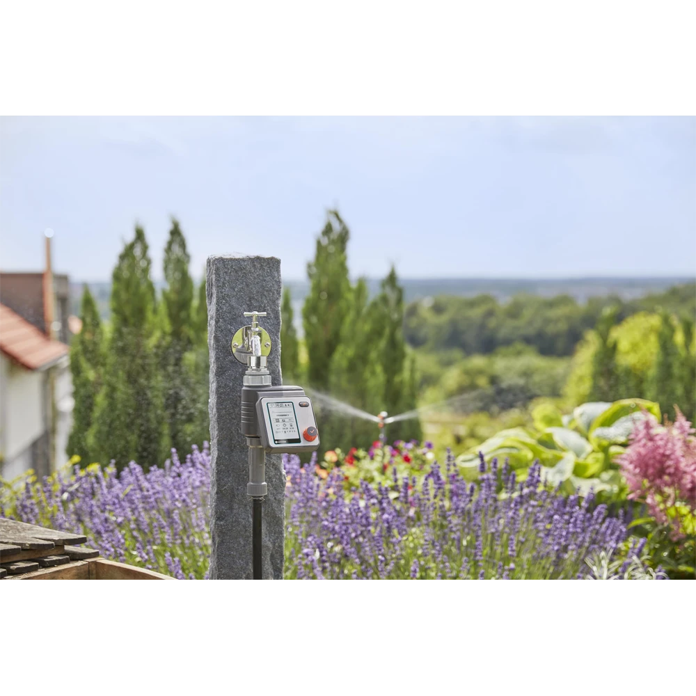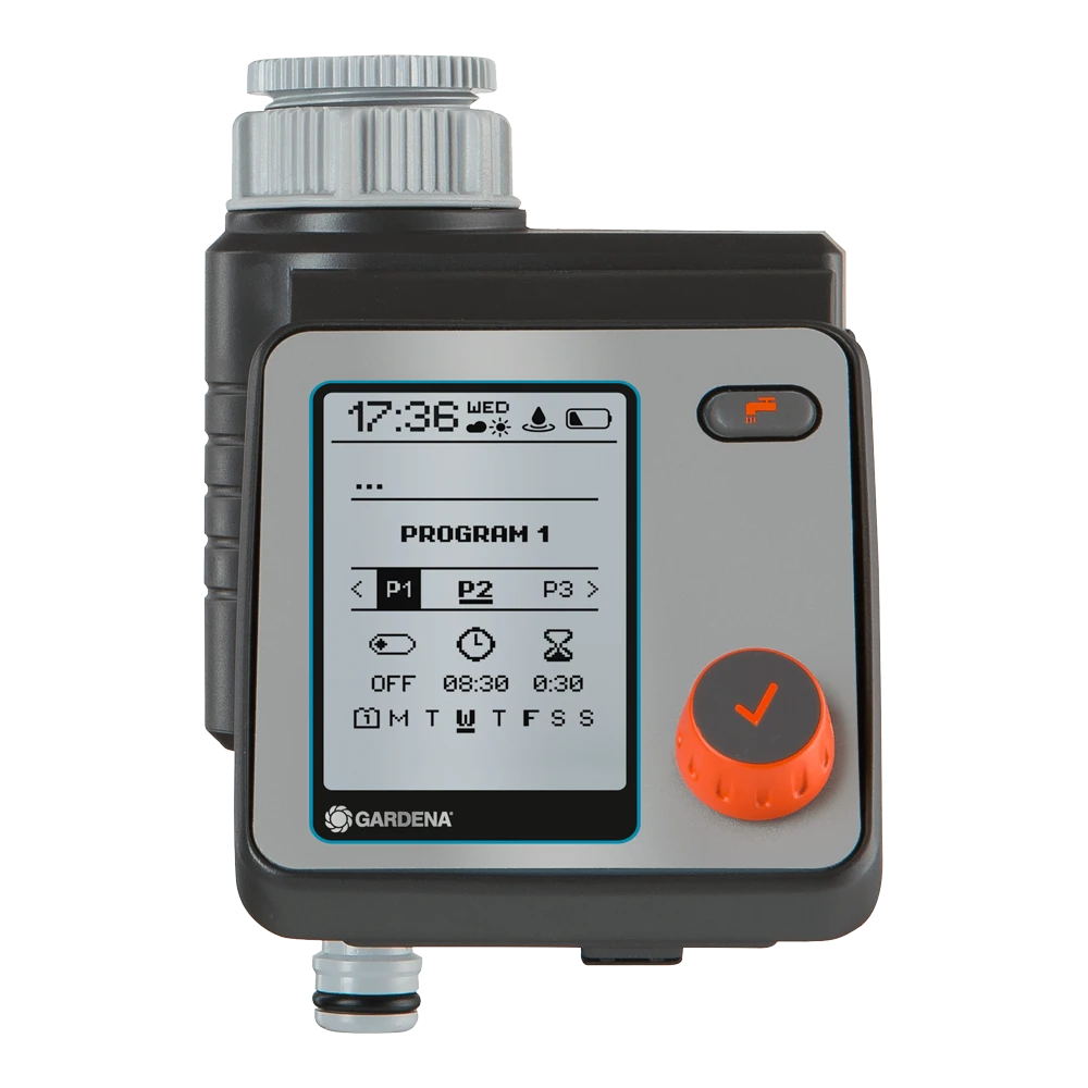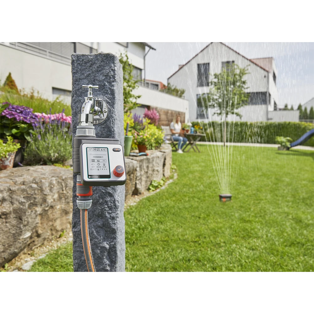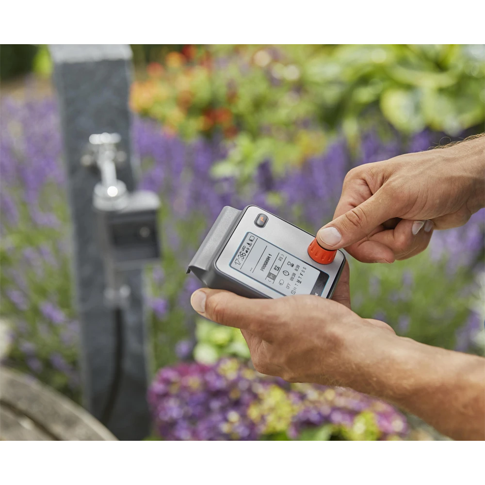Met de GARDENA besproeiingscomputer Master kan de besproeiing bijzonder flexibel en individueel worden ingesteld. Er kunnen maximaal zes verschillende en onafhankelijke planningen worden gemaakt. Het apparaat werkt op batterijen, is rechtstreeks op de kraan aangesloten en kan eenvoudig worden bediend met alleen een draai- en drukknop om de gegevens te selecteren en te bevestiging. Een gemakkelijk leesbaar, volledig grafisch display toont alle instellingen in één oogopslag. Het menu kan in 10 talen worden ingesteld. Het weerbestendige bedieningspaneel kan worden verwijderd. Het is gemakkelijk om de besproeiingsduur centraal aan te passen of om alle besproeiingen bij slecht weer stop te zetten. De unit is ideaal voor het automatisch regelen van de GARDENA waterverdeler. De Water Control Master kan ook worden gebruikt in combinatie met een GARDENA bodemvochtigheidssensor.